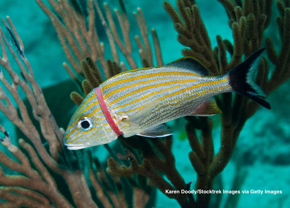 Rybka w głębi morza, wzdłuż jej oskrzeli zaklinowała się plastikowa gumka do włosów