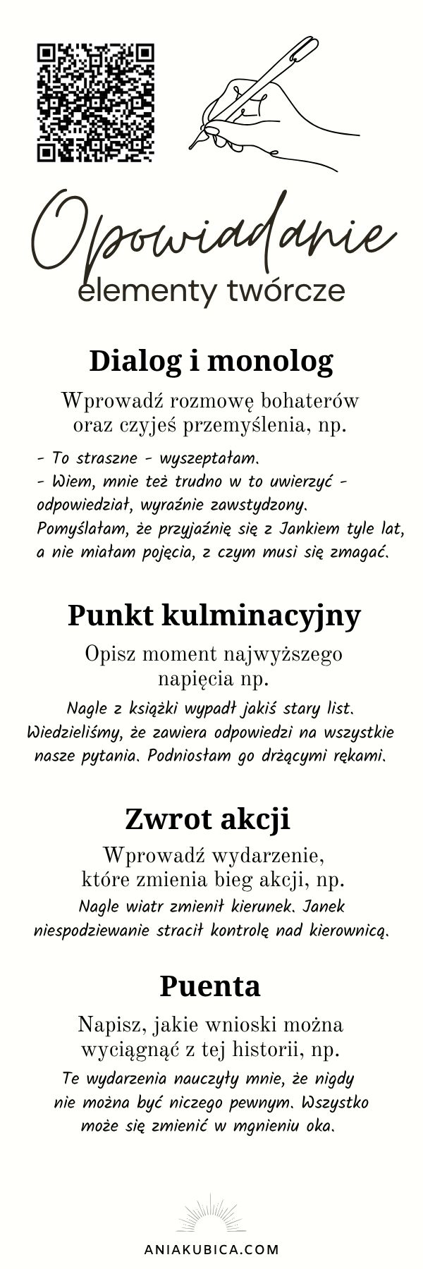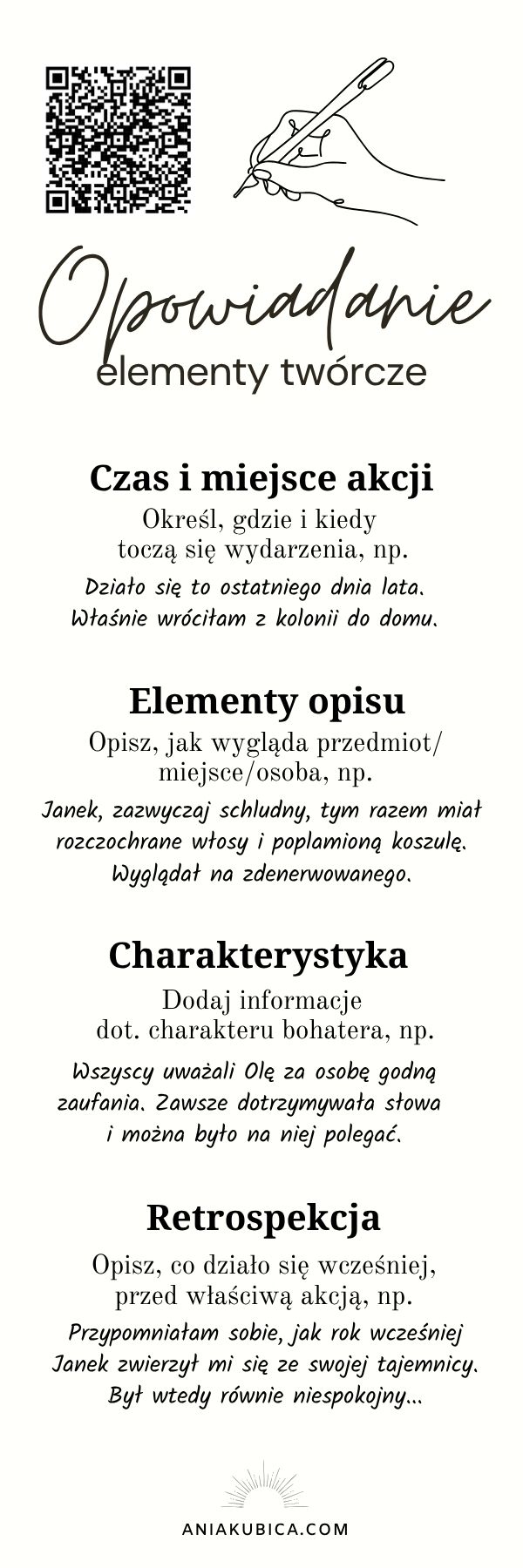 w opowiadaniu – jakie są elementy twórcze: czas i miejsce akcji, elementy opisu i charakterystyki, dialog i monolog, retrospekcja, punkt kulminacyjny, zwrot akcji i puenta (na egzaminie należy użyć minimum sześciu z nich).