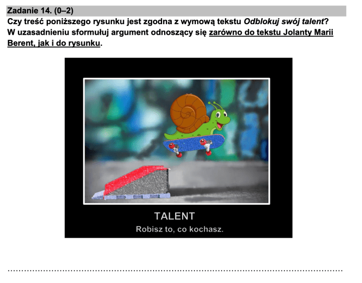 - Jedno z wydawnictw, aby zachęcić czytelników do rozwijania swoich talentów, dołącza do swoich książek zakładki inspirowane listą talentów Instytutu Gallupa. Projekty wybranych trzech zakładek mają napisy: „Odpowiedzialność”, „Rozwaga”, „Optymizm”. Wybierz jedną z tych trzech zakładek. Podaj bohatera lektury obowiązkowej, który wykazał się cechą wskazaną na wybranej przez Ciebie zakładce, oraz tytuł tej lektury. Uzasadnij swój wybór. W uzasadnieniu przywołaj sytuację z tej lektury potwierdzającą Twoje stanowisko.