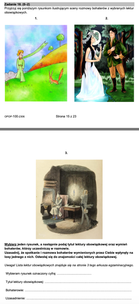 - Przyjrzyj się poniższym rysunkom ilustrującym sceny rozmowy bohaterów z wybranych lektur obowiązkowych. Wybierz jeden rysunek, a następnie podaj tytuł lektury obowiązkowej oraz wymień bohaterów, którzy uczestniczą w rozmowie. Uzasadnij, że spotkanie i rozmowa bohaterów wymienionych przez Ciebie wpłynęły na losy jednego z nich. Odwołaj się do znajomości całej lektury obowiązkowej.