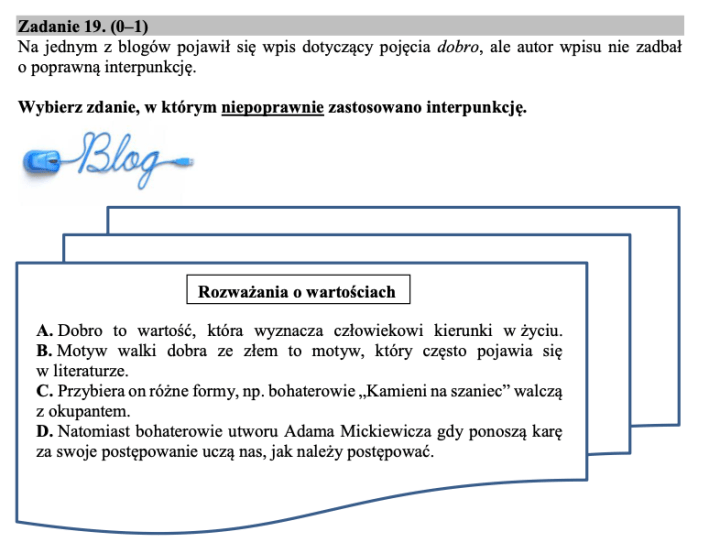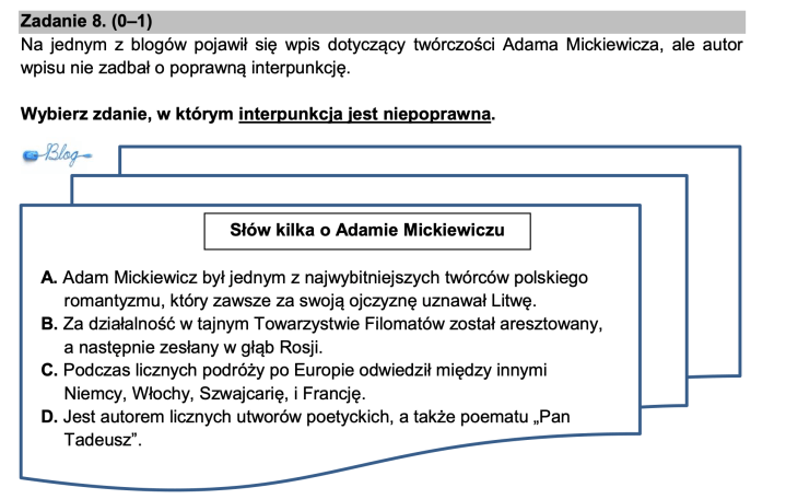 Na jednym z blogów pojawił się wpis dotyczący twórczości Adama Mickiewicza, ale autor wpisu nie zadbał o poprawną interpunkcję. Wskaż zdanie, w którym interpunkcja nie jest poprawna.