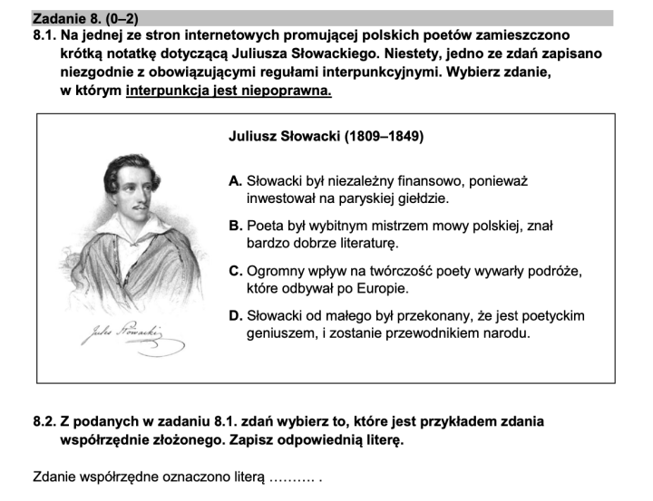 Na jednej ze stron internetowych promującej polskich poetów zamieszczono krótką notatkę dotyczącą Juliusza Słowackiego. Niestety, jedno ze zdań zapisano niezgodnie z obowiązujacymi regułami interpunkcujnymi. Wybierz zdanie, w którym interpunkcja jest niepoprawna.