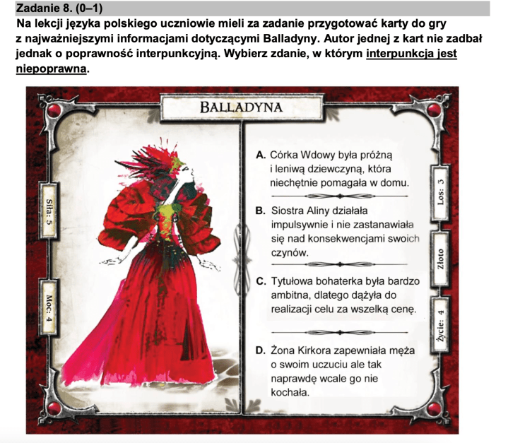 Na lekcji języka polskiego uczniowie mieli za zadanie przygotować karty do gry z najważniejszymi informacjami dotyczącymi Balladyny. Autor jednej z kart nie zadbał o poprawność interpunkcyjną. Wybierz zdanie, w którym interpunkcja jest niepoprawna.