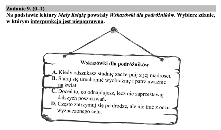 Na podstawie lektury „Mały Książę” powstały „Wskazówki dla podróżników”. Wybierz zdanie, w którym interpunkcja jest niepoprawna.