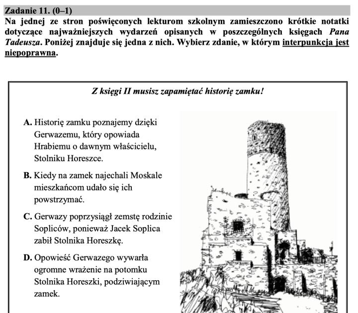 Na jednej ze stron poświęconych lekturom szkolnym zamieszczono krótkie notatki dotyczące najważniejszych wydarzeń opisanych w poszczególnych księgach „Pana Tadeusza”. Poniżej znajduje się jedna z nich. Wybierz zdanie, w którym interpunkcja jest niepoprawna.