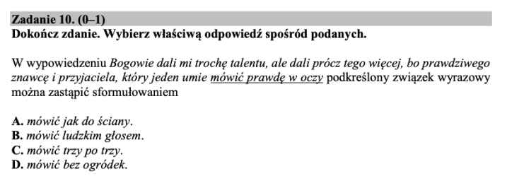 W wypowiedzeniu: „Bogowie dali mi trochę talentu, ale dali prócz tego więcej, bo prawdziwego znawcę i przyjaciela, który jeden umie mówić prawdę w oczy” związek wyrazowy „mówić prawdę w oczy” można zastąpić sformułowaniem