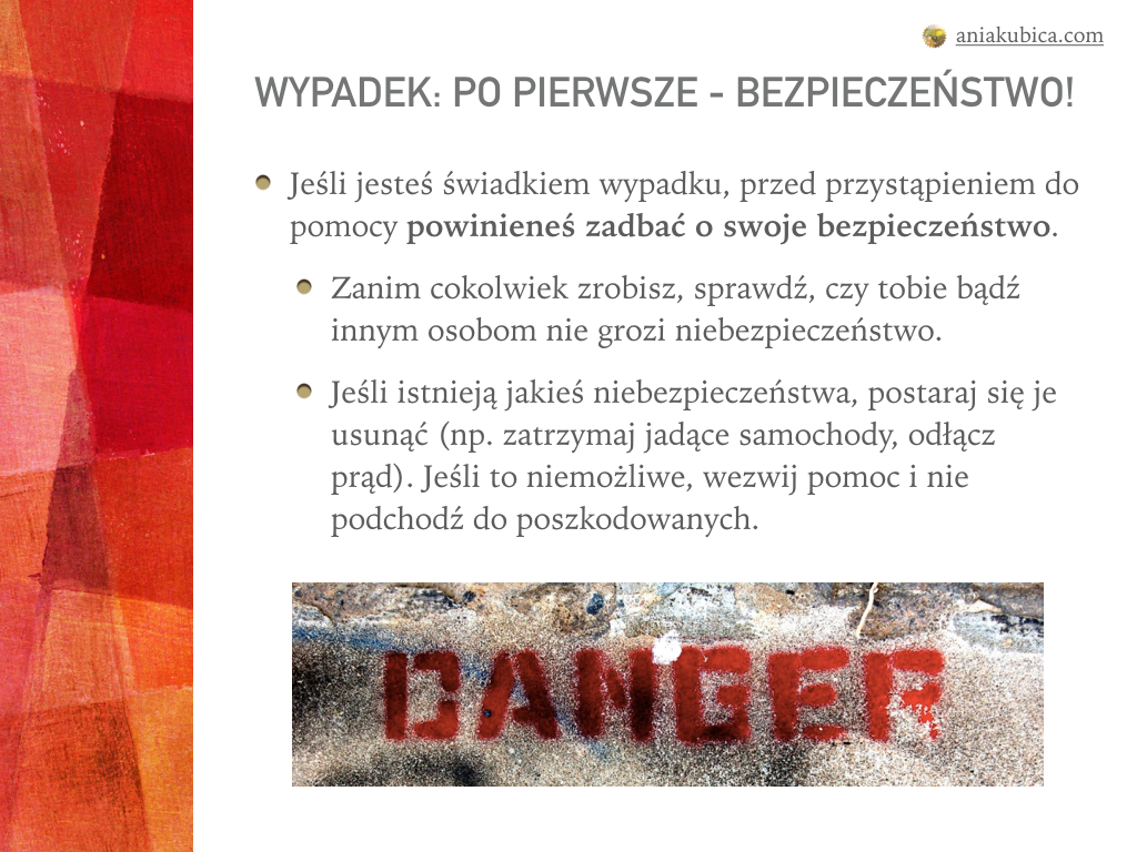 Zapoznaj się z prezentacją, która mówi o podstawowych działaniach w przypadku większości sytuacji, jakie mogą nas spotkać. Pamiętaj: wiedza, jak się zachować w przypadku wypadku bądź jakiegokolwiek zagrożenia zdrowia lub życia, jest bezcenna.