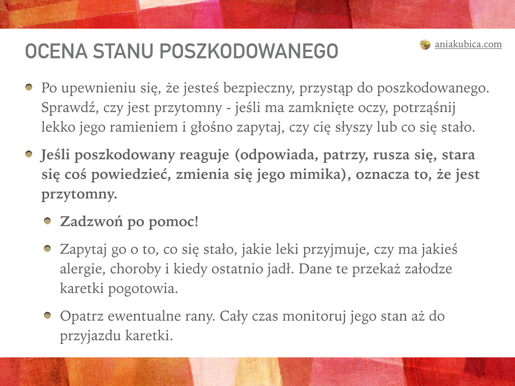 - Upewnij się, że nie grozi ci niebezpieczeństwo, i dopiero wtedy podejdź do poszkodowanego.